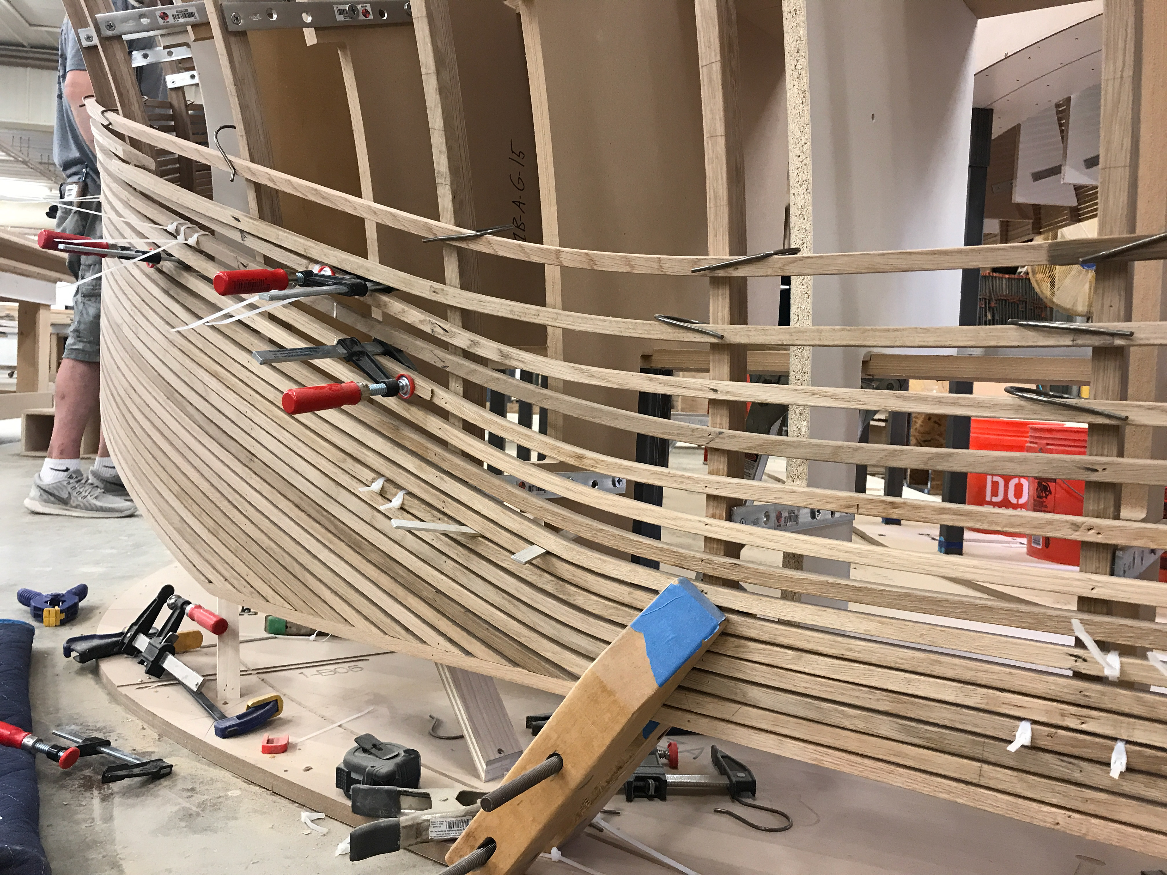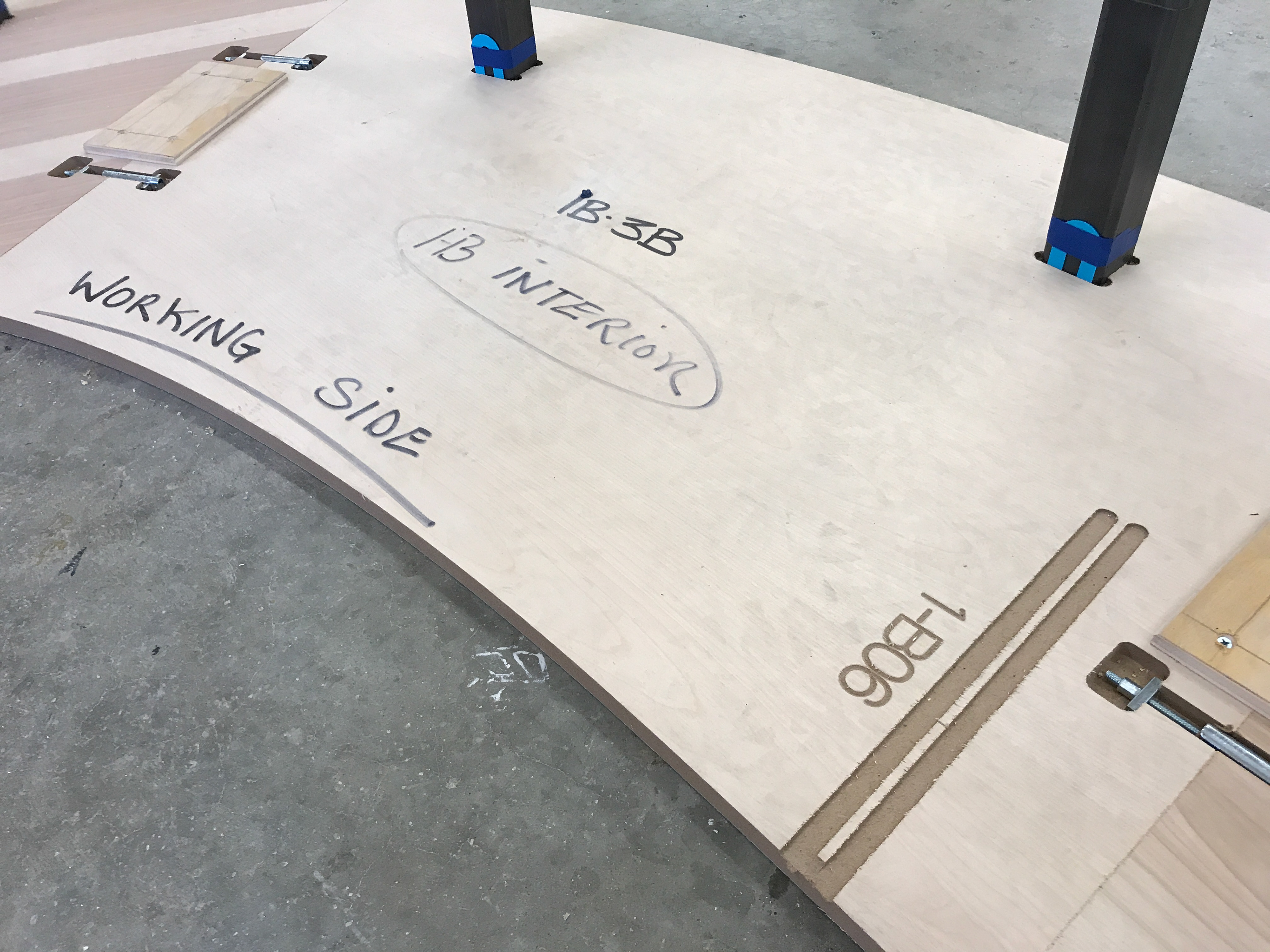 Beyond bent wood, each of the 13 unique components were fitted with custom steel outriggers. These were also built into the model parametrically, with careful consideration taken of construction tolerances, concrete slab edge accuracy, and design preferences—even the attachment knobs are placed to hide behind the horizontal stringers.