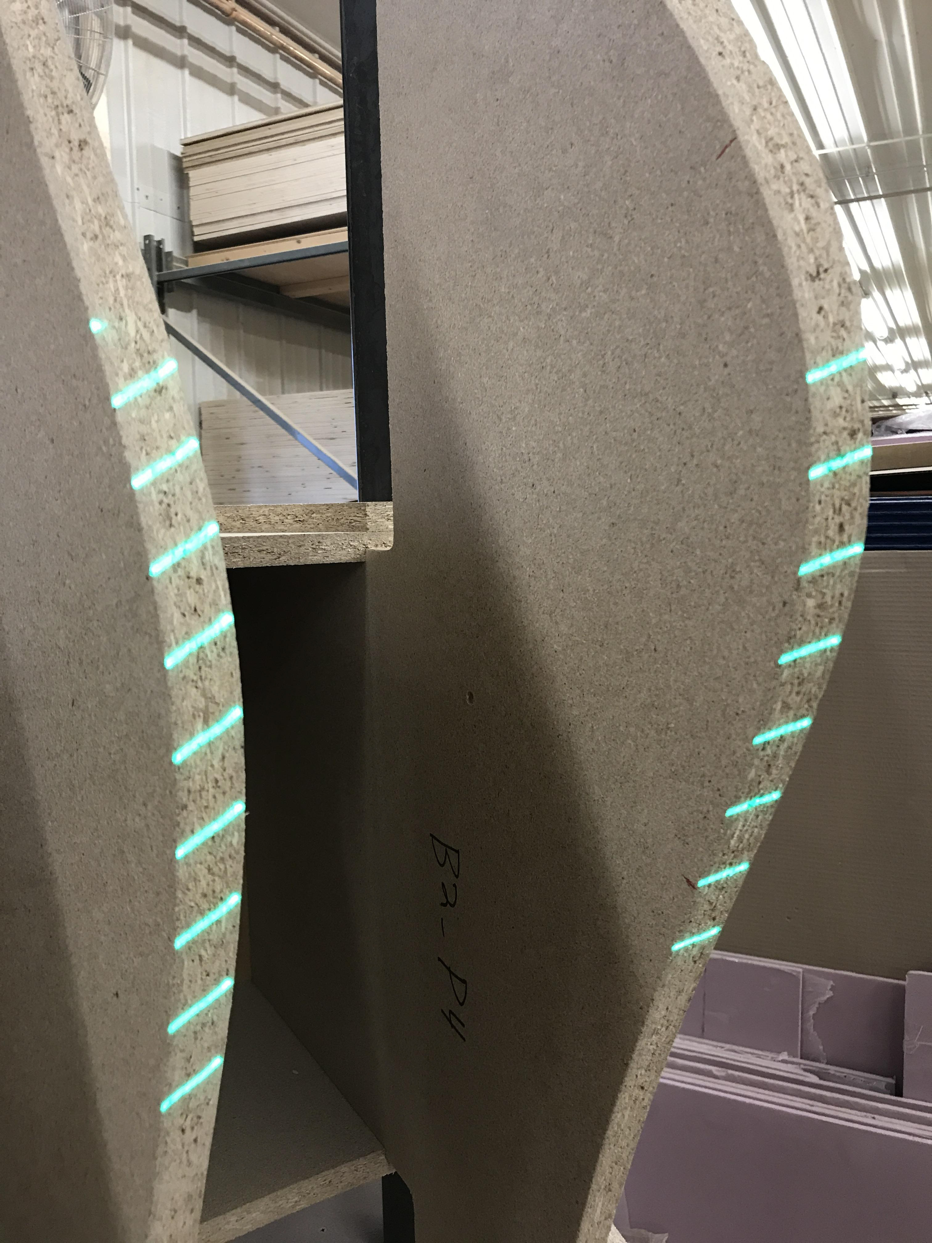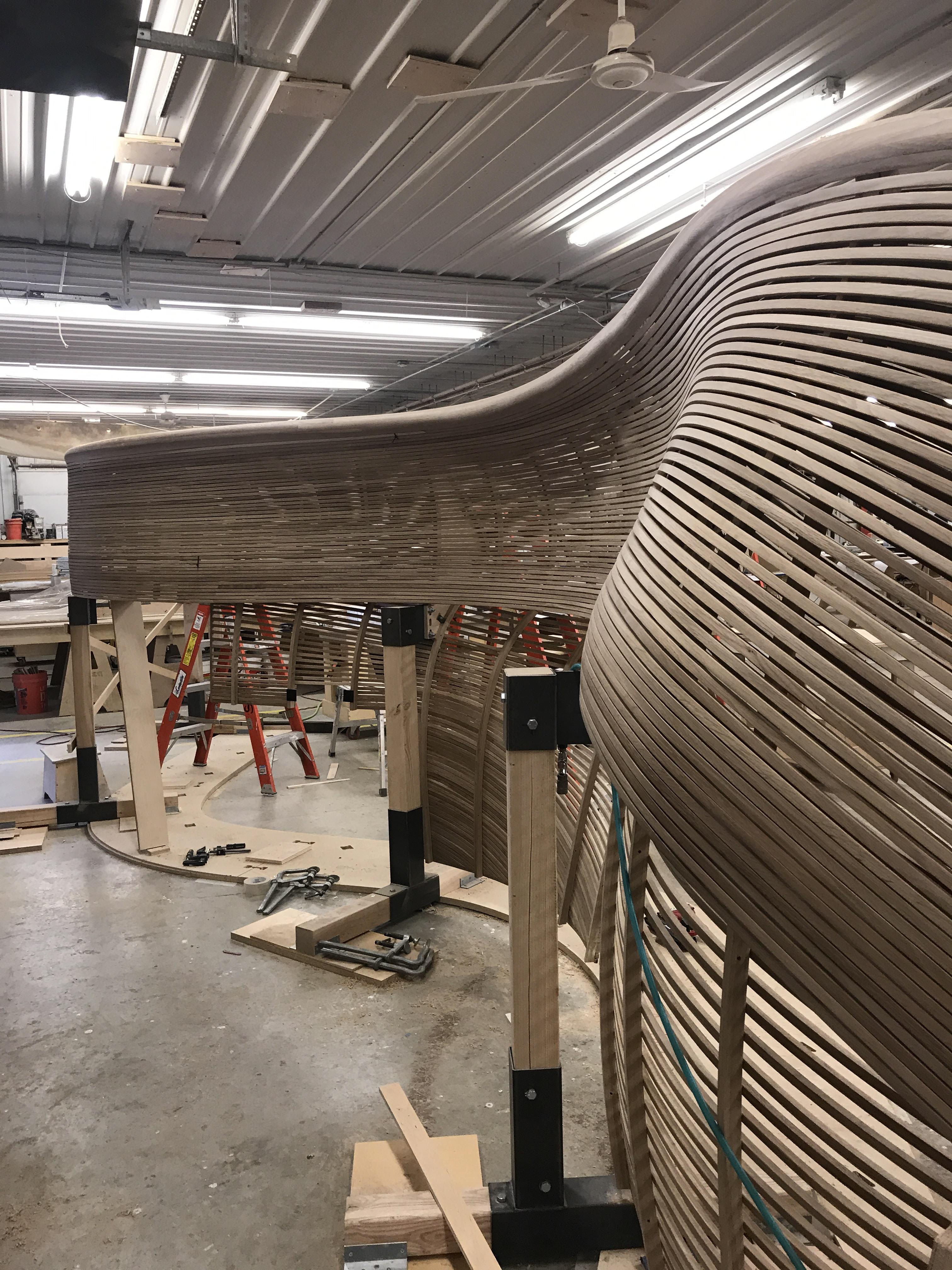 All fabrication geometry was modeled parametrically, including jigs for assembly, finishing, shipping, and installation—this allowed us to keep up with aggressive design changes without sacrificing real-life workability. Further, collaboration with FARO brought the project to a new level. Generating laser projection geometry ensured efficient, repeatable product builds and an incredibly accurate install. This work was presented across the US, and netted the project the 2019 ARCHITECT Magazine R+D Award, among several others.